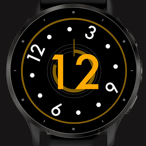 A rotating watch face prioritizing timeless aesthetics. Hours rotate around the edge, while minutes are displayed bold and big in the center, keeping the time easy to read at a glance. Stats are elegantly restrained as a series of rings in the center of the watch, detailing completion of three customizable statistics from your watch.